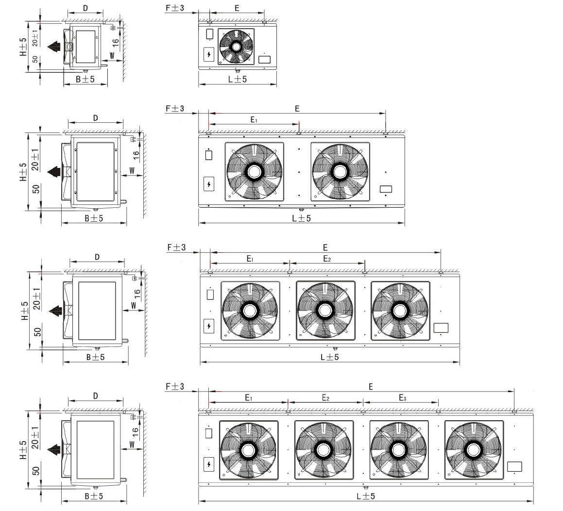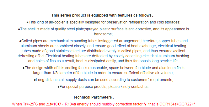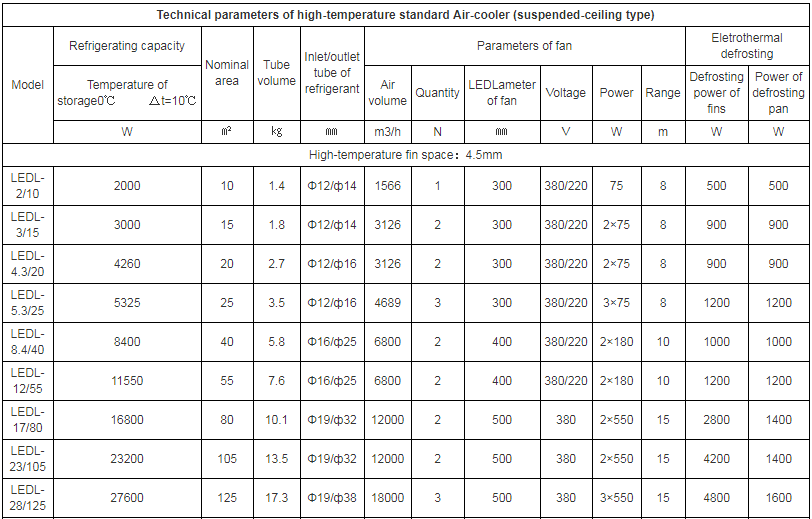 Products features:LED series Air-cooler is one kind of storage cooling equipment used in freon refrigerating, according to applicable temperature, there are 3 series including LEDL, LEDD and LEDJ,which can be used at different storage temperatures. LEDL type air-cooler is mainly applicable to about 0℃ fresh-preserved storages; LEDD type air-cooler is mainly applicable about -18℃ cold storages; LEDJ type cooling fan is mainly applicable to quick-freezing storages below-25℃.